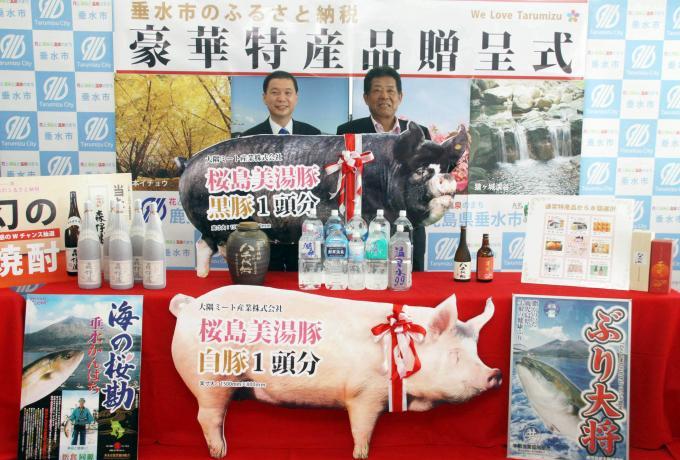 垂水市では、平成27年9月から、寄附額100万円以上の方へ「プレミアム・タルミズ(当時名称:豪華特産品)」をお送りすることとしており、その寄附者第1号である、元関東垂水会会長の大園様に対して豪華特産品を贈呈いたしました。