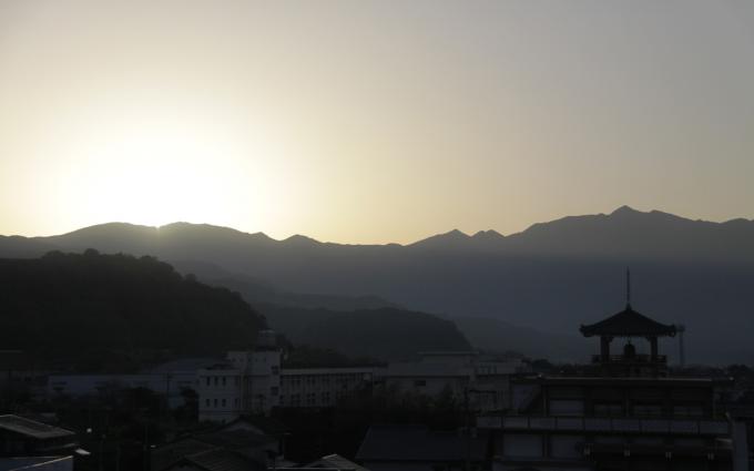 「春はあけぼの。やうやうしろくなりゆく山ぎは、すこしあかりて・・・」。枕草子では、春は夜が明け始め、東の空がほのかに明るんでくる様子に趣があると記されています。垂水市からも高隈山の稜線が朝日によって明るんでくる様子を望むことができます。時を同じくして、光源寺の梵鐘の音色が一日の始まりを告げました。
