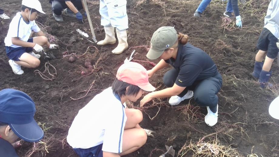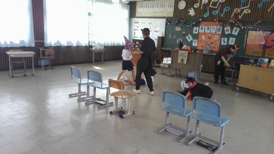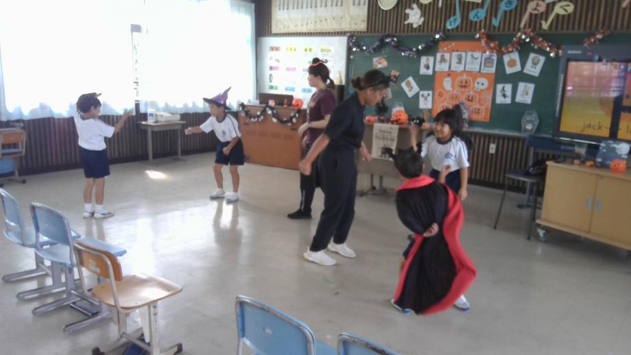 10月5日のいもほりと英語学習の様子です。ALTの先生もいもほりに参加しました。いもほりは、地域のふるさと先生のご協力をいただいて実施しました。ふるさと先生には、いも、落花生、もち米等を活用した食農教育で年間を通して学習支援をしていただいています。本当にありがとうございます。1・2年生は、英語学習で、ALT及び学級担任の先生とハローウィンの衣装を着て、異文化体験の活動に取り組みました。一人一人の子供が笑顔でとても楽しそうでした。