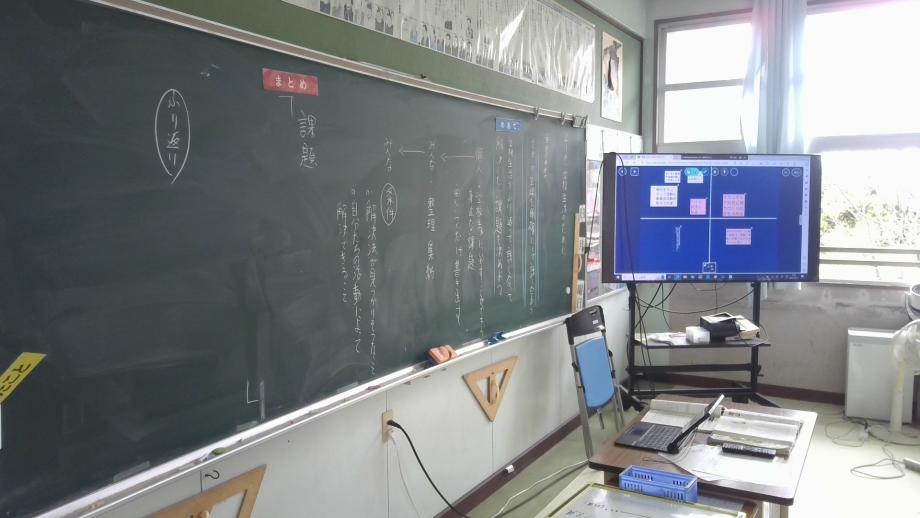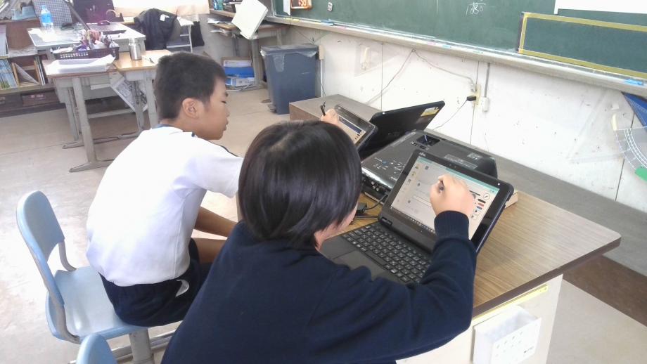 5・6年生は、国語の授業で、話すこと・聞くことの学習に取り組んでいました。5年生はよりよい学校生活について、朝のボランティア活動や体力づくりのことについてタブレット端末を活用して意見を交流していました。6年生は、昨日の学習を基に、学校生活をより楽しくする方法について話し合っていました。
