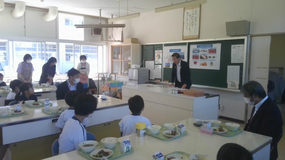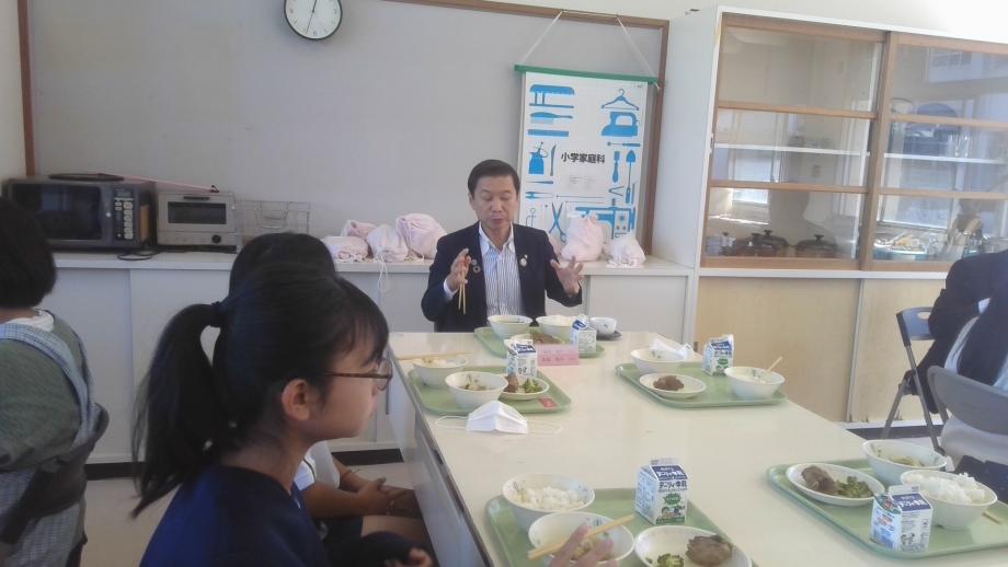 栄養教諭の先生の話の後、垂水市長より子供たちに話がありました。垂水市長は、子供たちと給食を一緒に食べていただきました。
