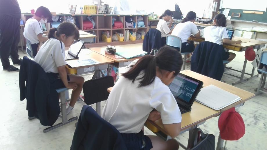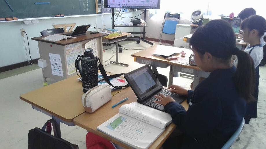 5年生の国語科は説明的文章の固有種が教えてくれることの学習で、写真・グラフ・表等の資料と文章を対応させながら、資料の効果についてタブレット端末でまとめていました。