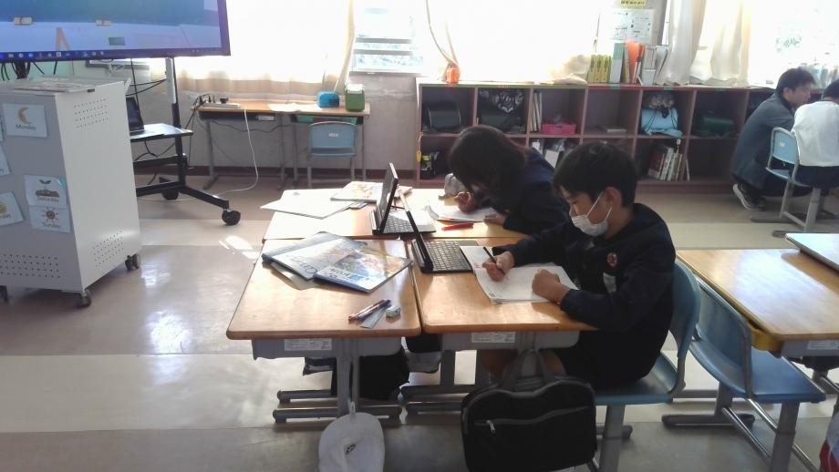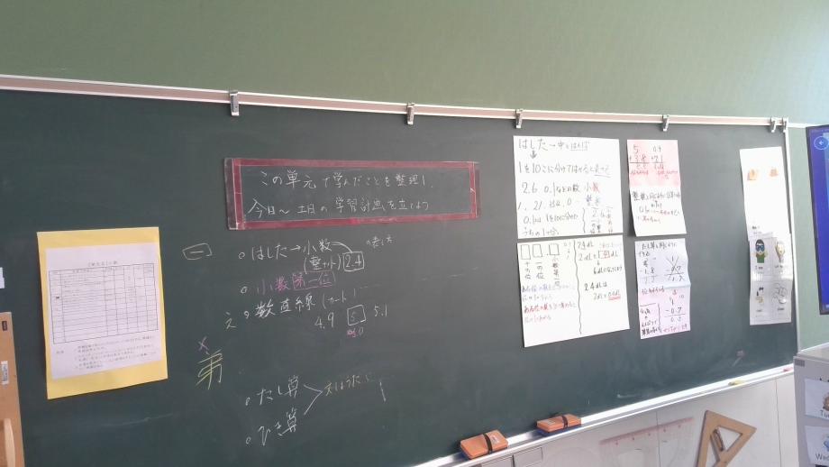 3・4年生の算数科は、単元内自由進度学習でした。3年生は小数の計算、4年生は面積の学習のまとめに自分たちでプリントを選んで取り組んでいました。担任の先生からこれまで学習したことが黒板にもカードで示され、困ったときはそのカードを見ながら学習に取り組めます。子供たちも単元を通して自分の目標の達成度を確かめながら進んで学習に取り組んでいます。