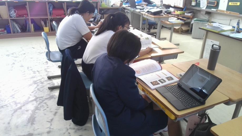 6年生は、国語で、図書室の本とタブレット端末を活用して、パンフレット作りに取り組んでいました。