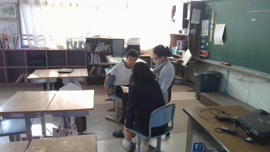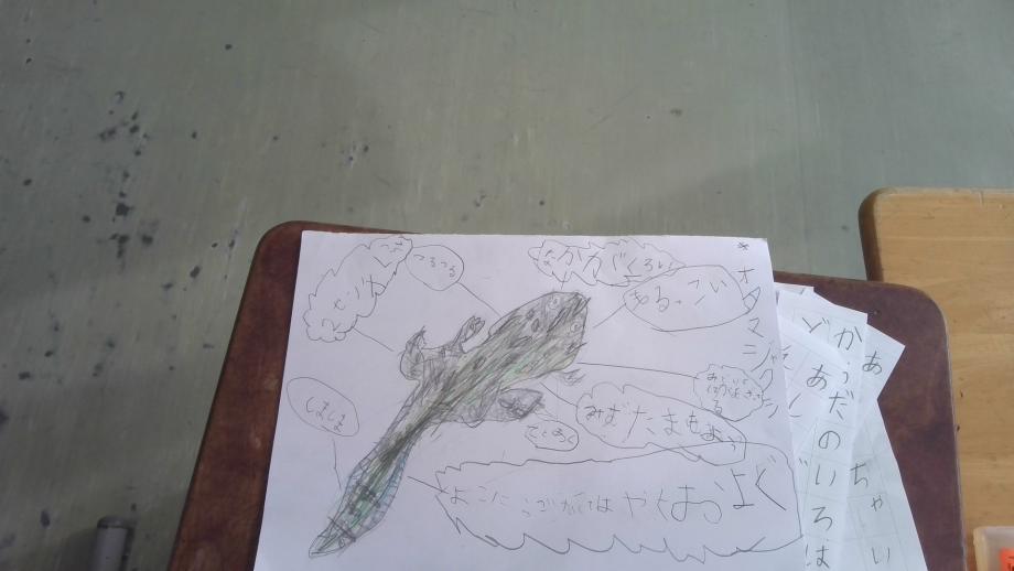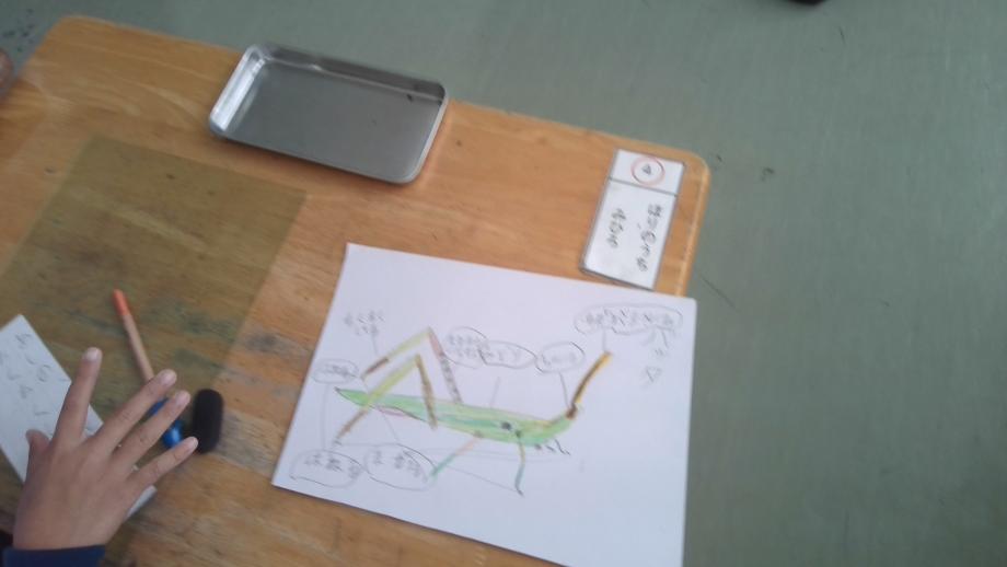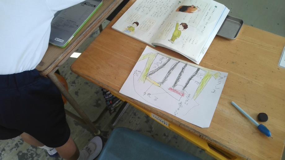 1時間目の授業は、1年生は国語の授業で、家の人等に伝えたいものを絵と言葉で表現していました。