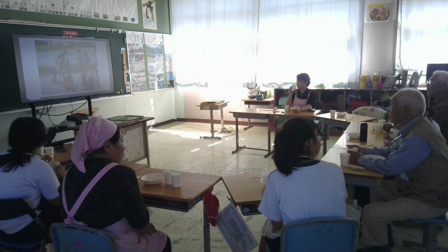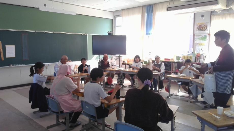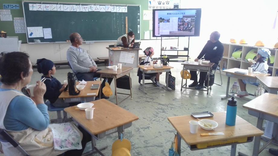 郷土料理教室の後は、郷土料理教室で使用した落花生、さつま芋栽培の植え付けから収穫までご支援をいただいたふるさと先生お礼の会をしました。子供たちは、郷土料理教室で作った料理と給食を、各教室でふるさと先生と一緒に食べました。各教室では、田植え、芋植え、稲刈り等ふるさと先生にお世話になった活動の写真を大型テレビで見たり、ふるさと先生にお礼を言ったりしました。