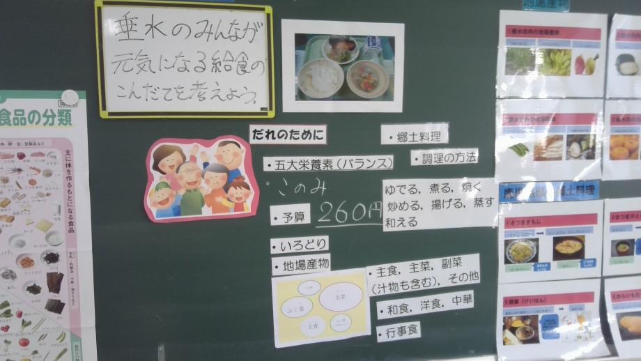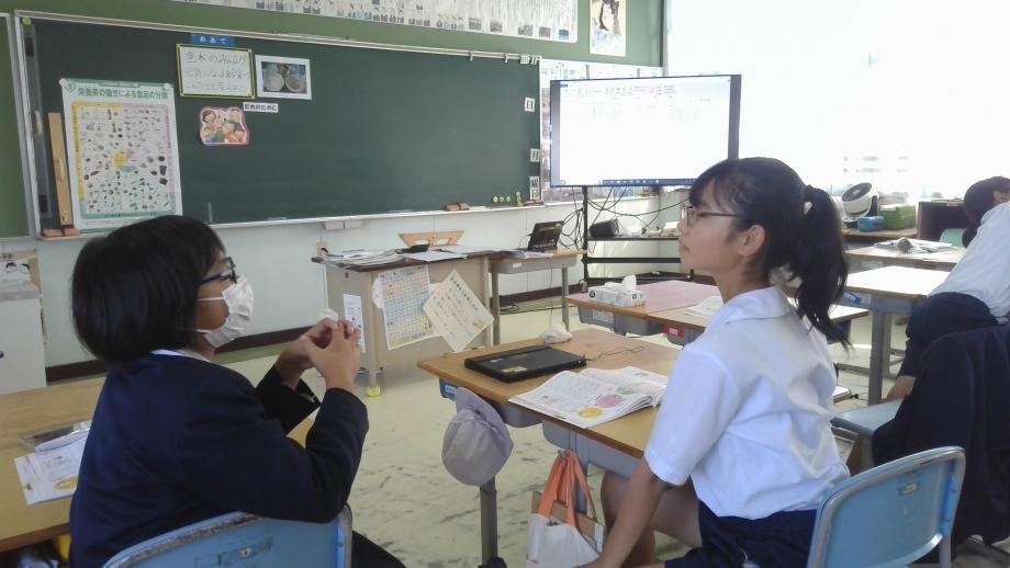 11月7日に食に関する指導で栄養教諭の先生に来校していただきました。家庭科で学習した五大栄養素の考え方を活用しながら、給食の献立を考えました。子供たちもペアで給食にどんな献立があったらいいかを話し合いました。