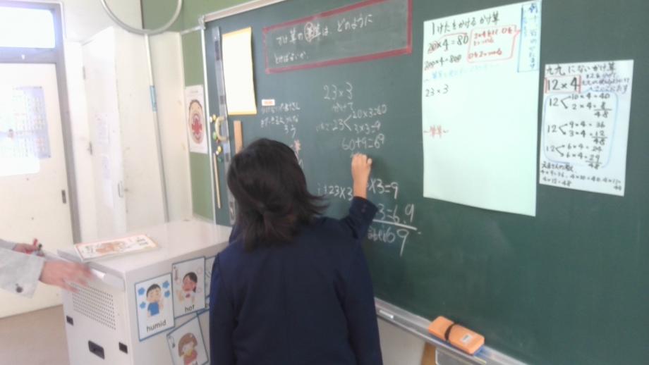 3・4年生は、算数の学習でした。3年生は、2けた×1けたのかけ算、4年生は、小数のかけ算でした。一人一人の子供が自分の目標が達成できるように、学習計画に沿ってがんばっていました。単元内自由進度学習で、自分の目標に沿って、計算ドリル、プリント、AIドリル等から選んで意欲的に学習に取り組めていました。担任の先生と適宜学習の進め方についても確認しながら学習ができています。