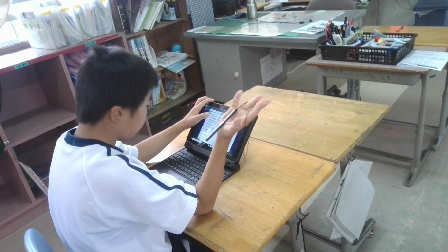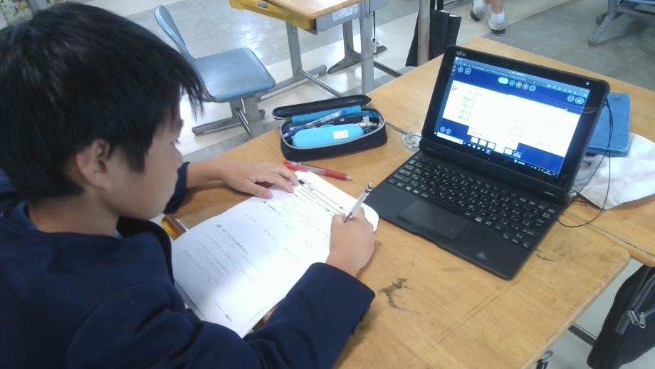 1年生は、算数の文章題で式がたし算・ひき算のどちらになるかを算数ノートを使って○などを書き、自力で問題解決に取り組んでいました。2年生はかけ算九九の8の段の学習に入りました。学習カードをもって覚えたかけ算を校内の先生に聞いてもらっています。3年生はかけ算の問題がタブレット端末、プリントを活用してすらすら解けるようになりました。4年生も小数のかけ算をがんばっています。