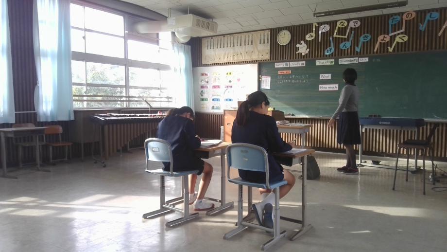 11月16日は、垂水中央中学校の英語科の先生、垂水市教育委員会のJTEの先生が来られて、外国語科の授業がありました。5年生は、これまでに学習した表現を使って、お店で食べ物や飲み物を注文したり、注文した食べ物や飲み物の値段をたずねたりする活動に取り組んでいました。
