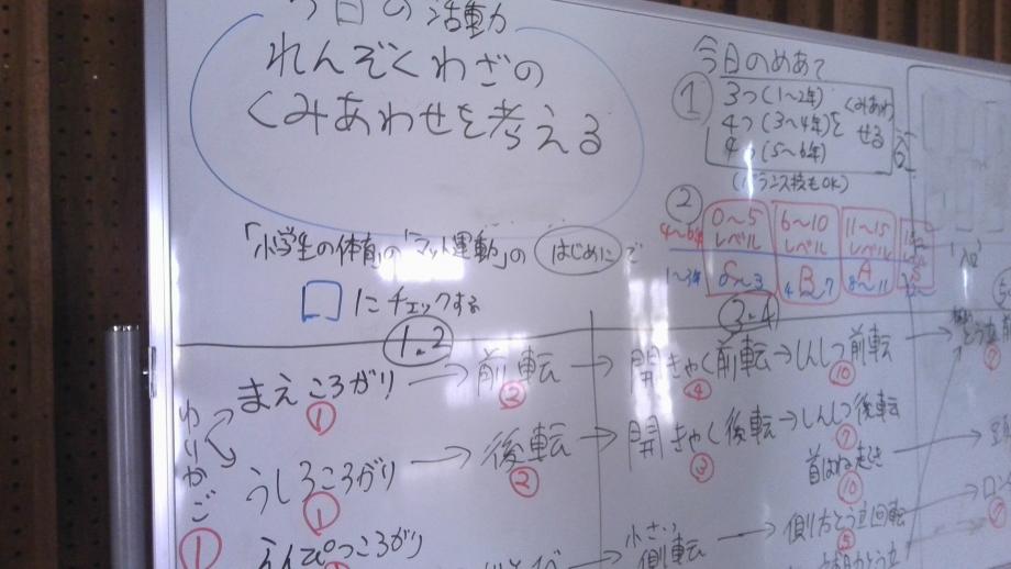 11月17日は、合同体育がありました。マット運動に取り組んでいます。開脚前転や開脚後転ができることを教えてくれました。練習の流れがホワイトボードに書いてあり、どんな技に挑戦しているかがよくわかりました。