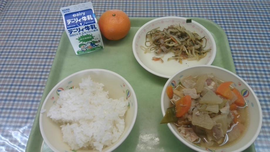 今週の給食は、垂水の味週間でした。旬のさやいんげん、美湯豚等の食材を活用した給食のメニューが今週はありました。17日のメニューは、パパイヤいため、みかん、豚肉と大根の煮物でした。