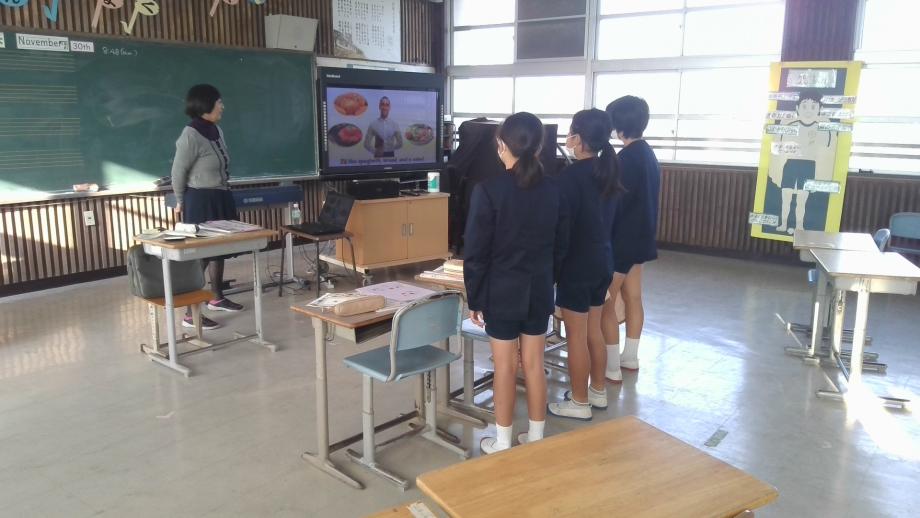 11月30日の子供たちの様子です。1年生は算数科の学習で広さくらべの活動に取り組んでいました。自分たちのもっているハンカチで広さをくらべていました。2年生は、かけ算の学習のまとめにタブレット端末を活用して取り組んでいました。5年生は、JTEの先生とお店で注文する表現について大型テレビで確認しながら学習に取り組んでいました。担当の先生から、パフォーマンステストでの子供たちのがんばりをほめていただきました。6年生は、食べ物の産地の英語での言い方について学習していました。