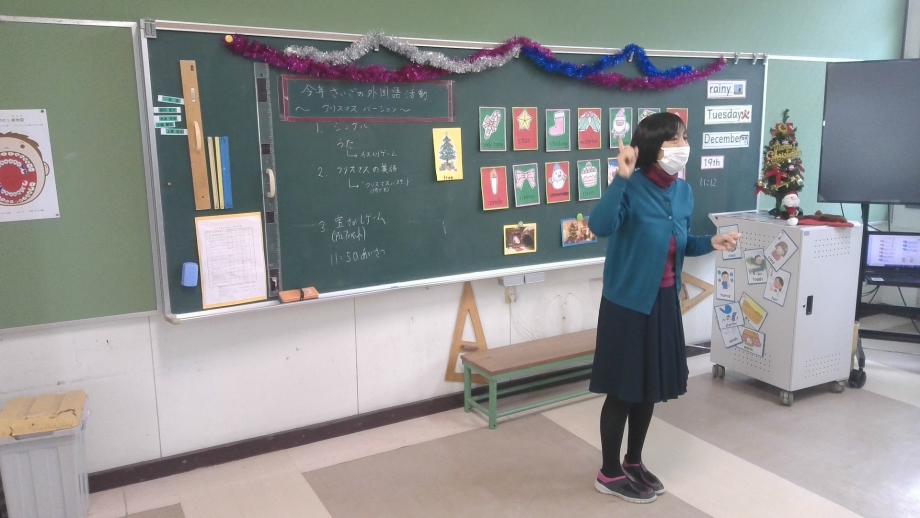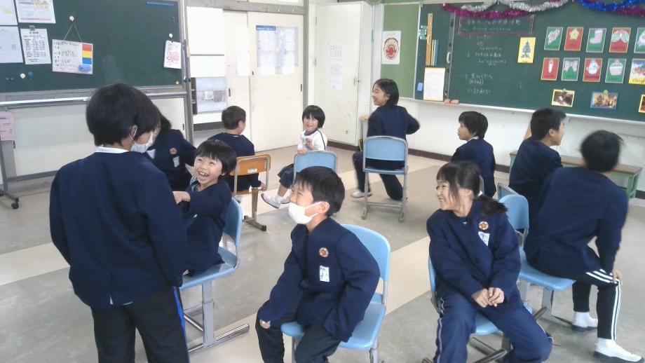 12月19日に、1~4年生合同の外国語活動がありました。2学期最後の外国語活動でした。クリスマスが近いということでクリスマスに関係のある英語の表現を学習しました。英語でクリスマスの歌を歌ったり、いすとりゲーム、カード探しゲームをして楽しみました。