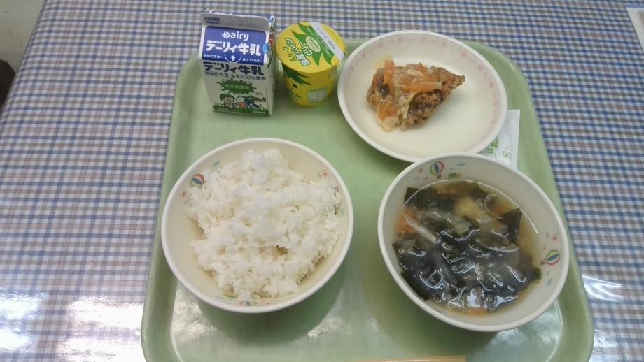 今日の給食は、麦ごはん、わかめスープ、かんぱちのあんかけ、パインゼリーでした。