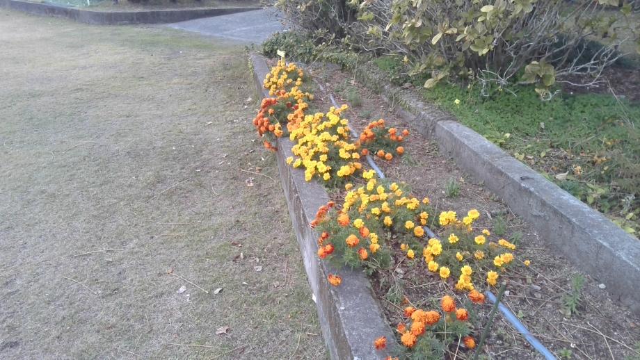 12月28日は、仕事納めです。校内を見ると、冬の花が成長してきました。また、夏の花のマリーゴールドも花が咲いています。