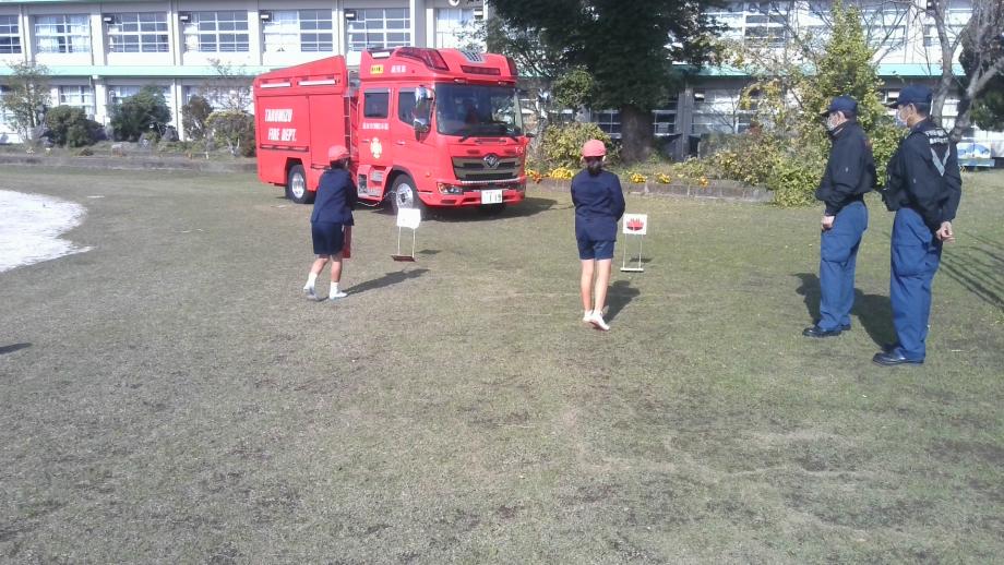 20日の3時間目は、避難訓練(火災)がありました。子供たちは、校内放送をよく聞いて、担任の先生の指示に従って落ち着いて避難することができました。最近の垂水市の火事の発生件数を教えてもらうとともに、水消火器を使って、消火器の使い方を学ぶことができました。消防車のひみつとして、消防車に搭載されている設備の話もしていただきました。