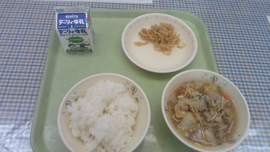 11月20日の給食は、ご飯、たくあんきんぴら、すきやきふうにでした。