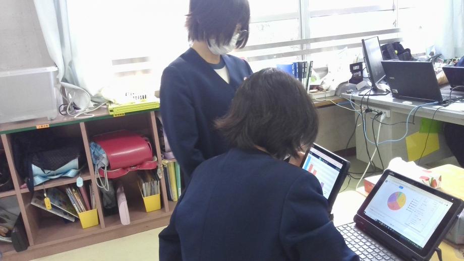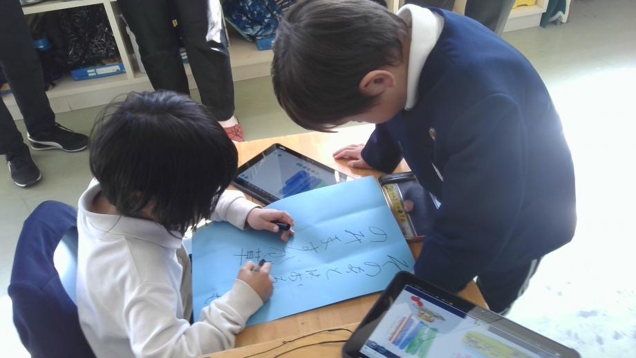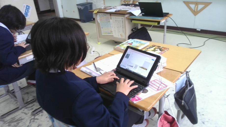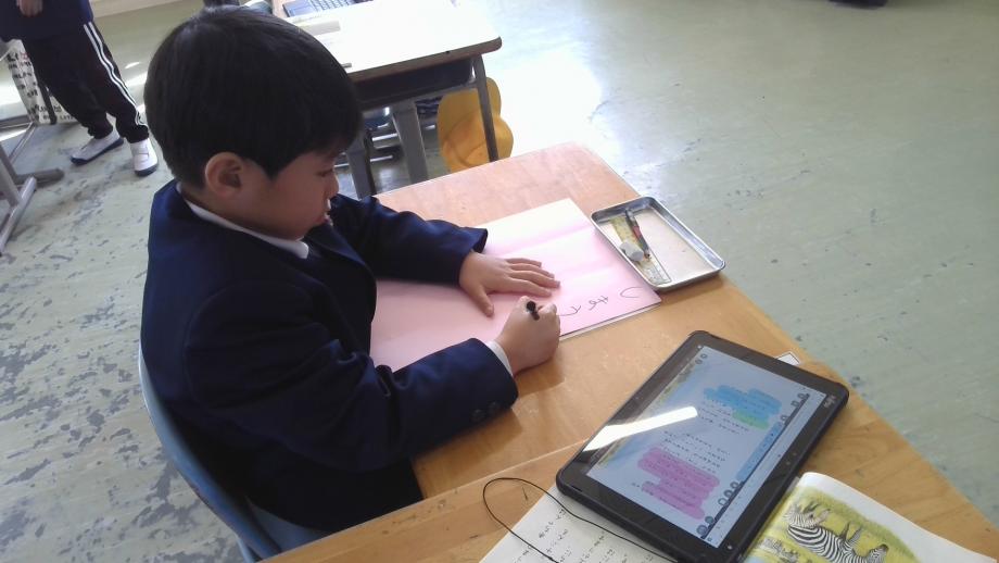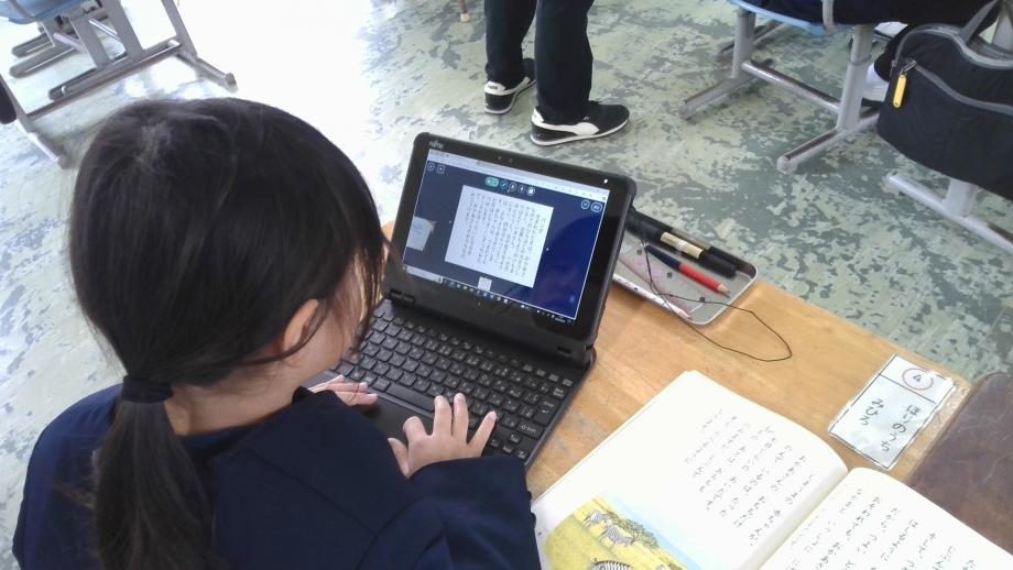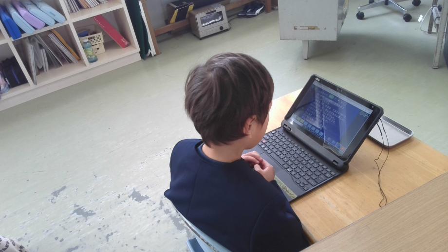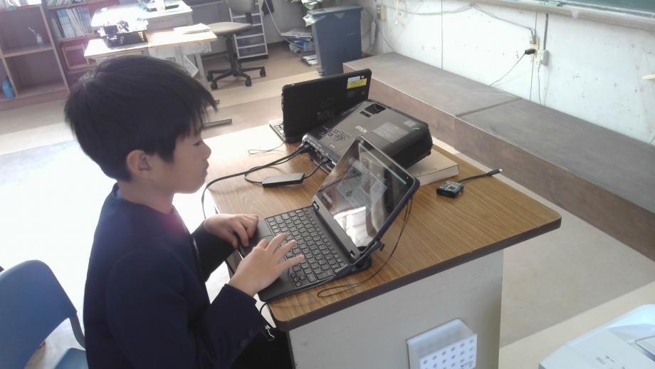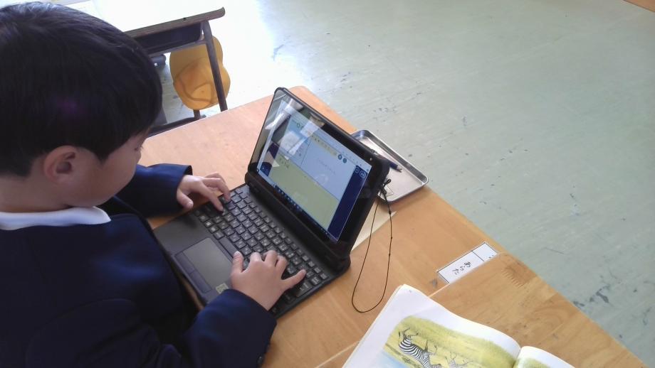 1・2年生は、生活科で、10日の生活科発表会に向けたスライドをタブレット端末を活用して作成していました。タブレット端末を使って、発表原稿を作成する際に、入力がスムーズにできるようになっています。