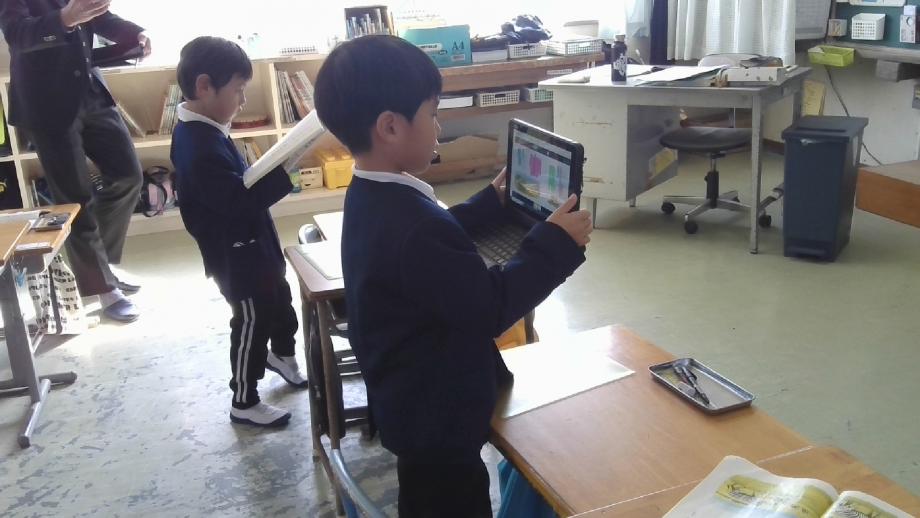 2月19日の4年生の理科の授業です。子供たちは、実験結果及び考察等についてタブレット端末を活用しながら進んで学習に取り組んでいました。