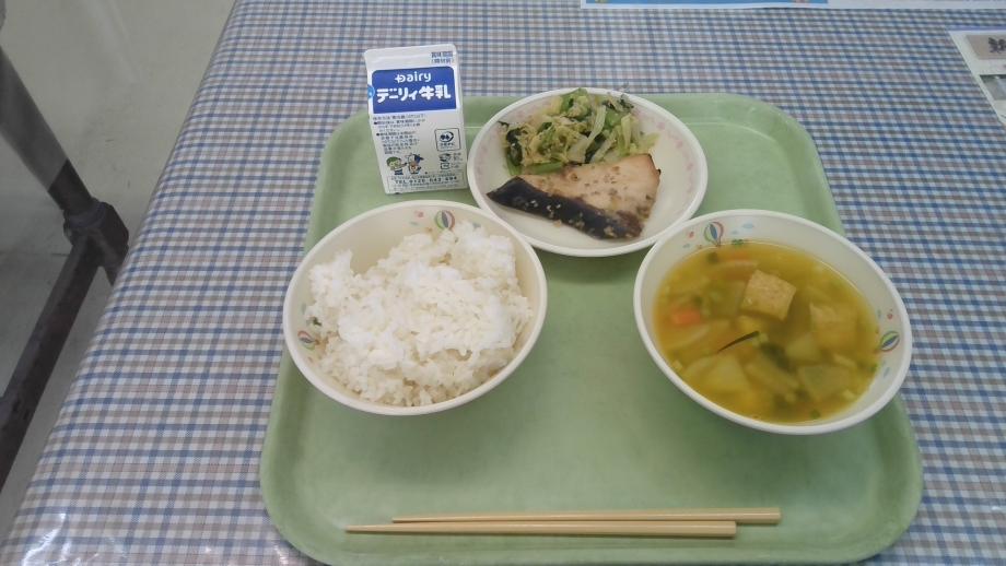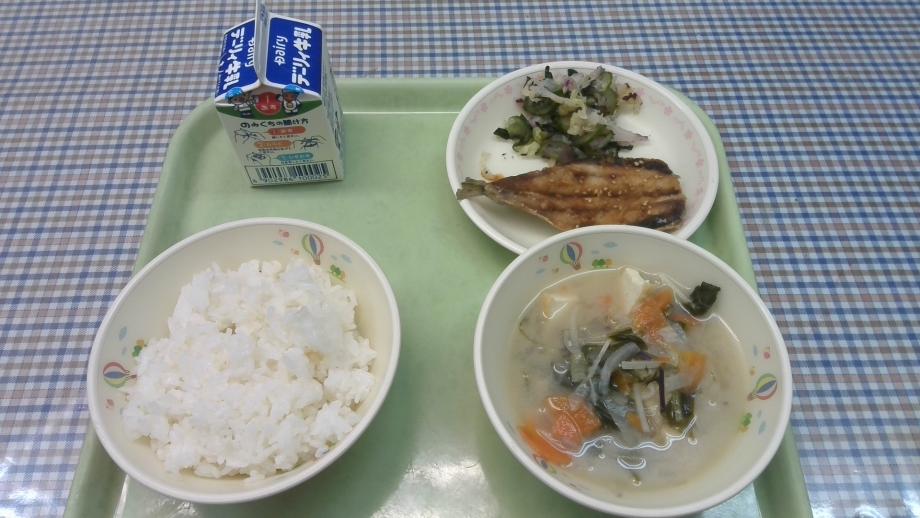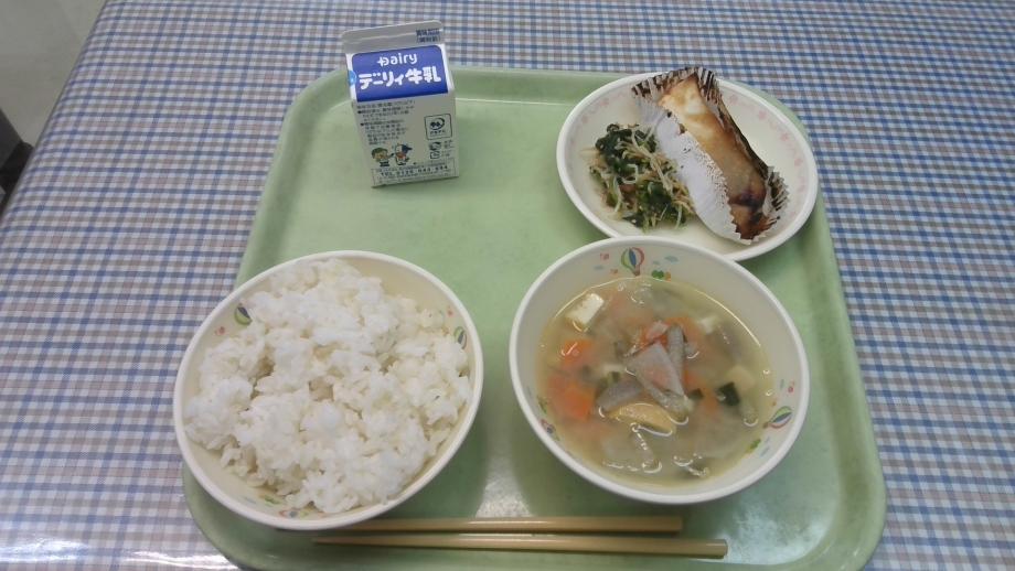 今日の給食のメニューは、むぎごはん、じばさんやさいのみそしる、ぶりのねぎしおやき、こまつなのごまあえでした。