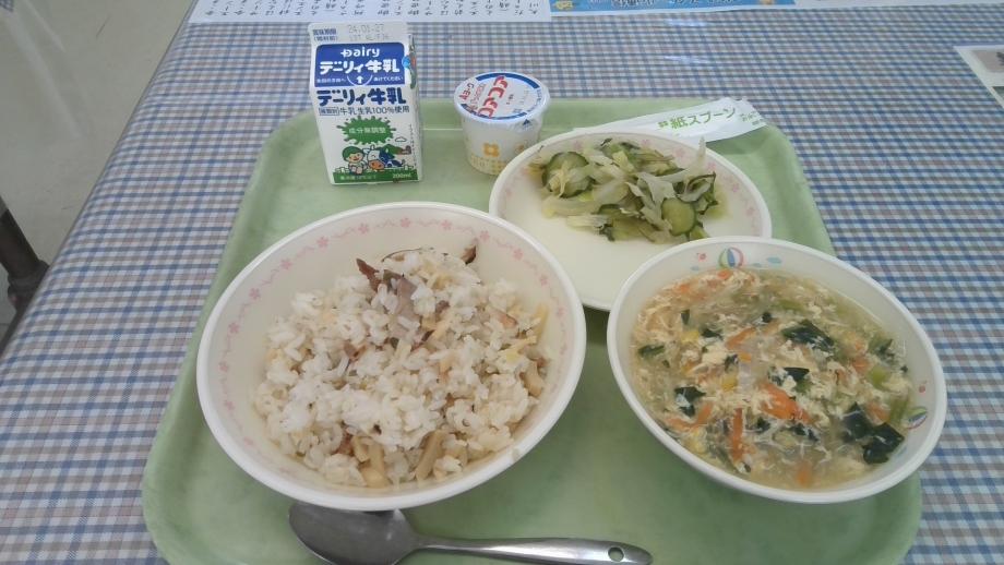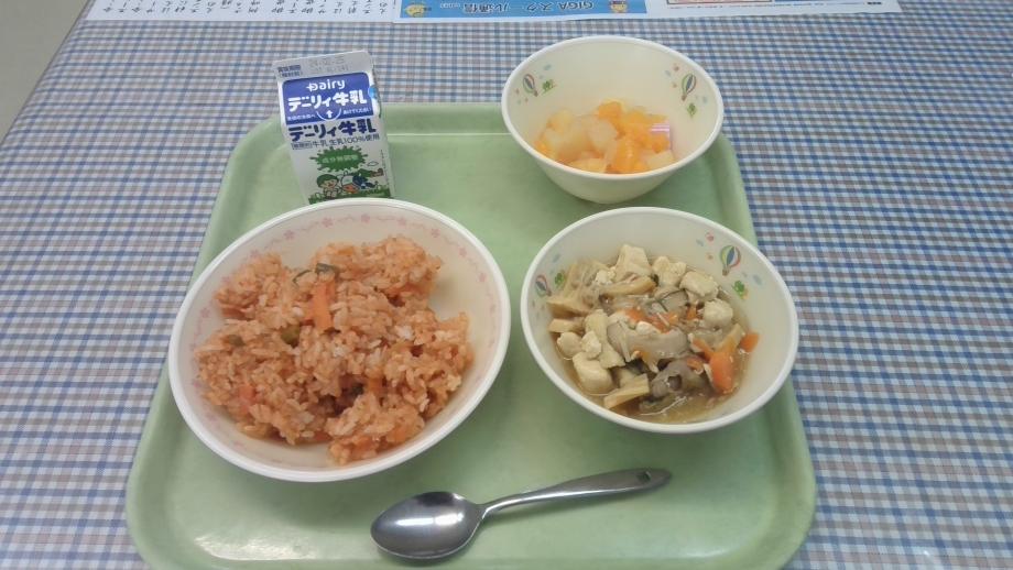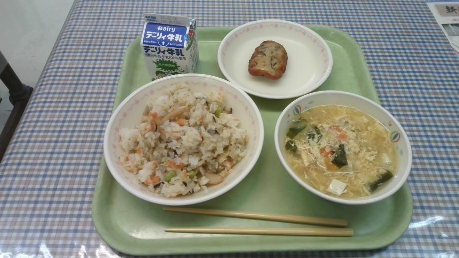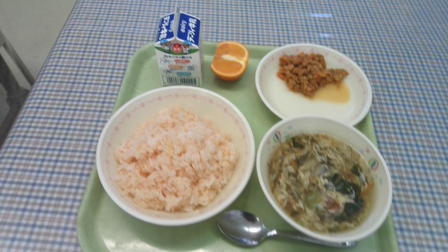 1月15日の給食は、本校の子供が垂水学校給食センターの栄養教諭の先生の食に関する指導の授業の際に考えたメニューでした。メニューは、チャーハン、牛乳、たまごスープ、海藻サラダ、ヨーグルトです。とてもおいしかったです。