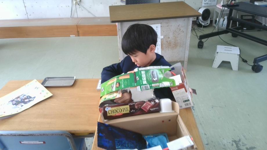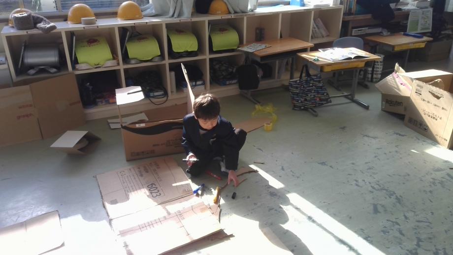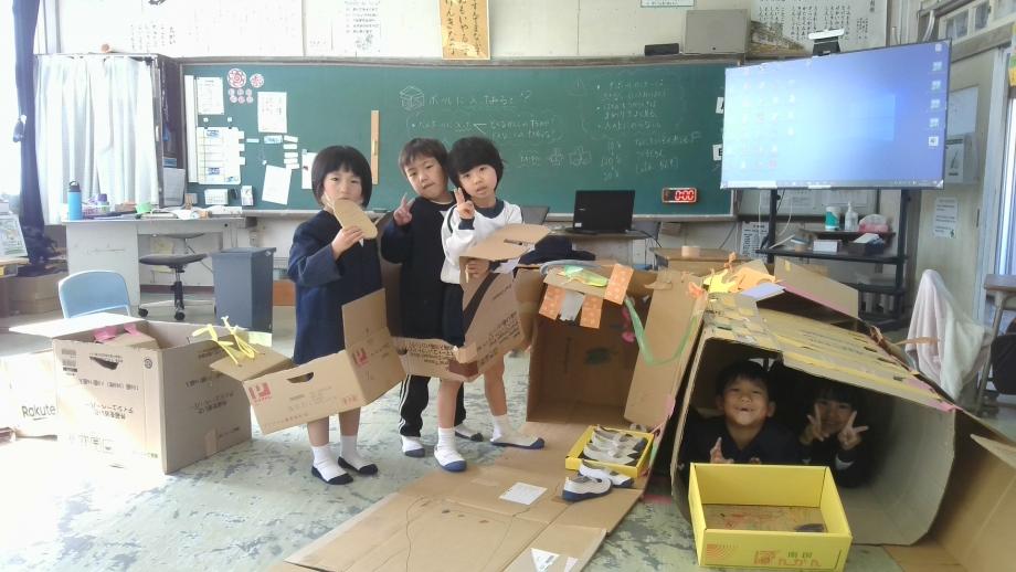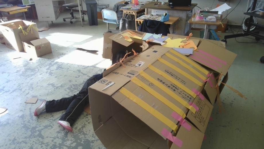 1・2年生の図画工作科は、段ボールに入ってみるとという学習で、段ボールをいろいろな形に変身させて、子供たちは体全体で楽しみました。登校のときから、段ボールを準備して、図工をとても楽しみにしていた1・2年生は、友達と協力して活動する姿が印象的でした。