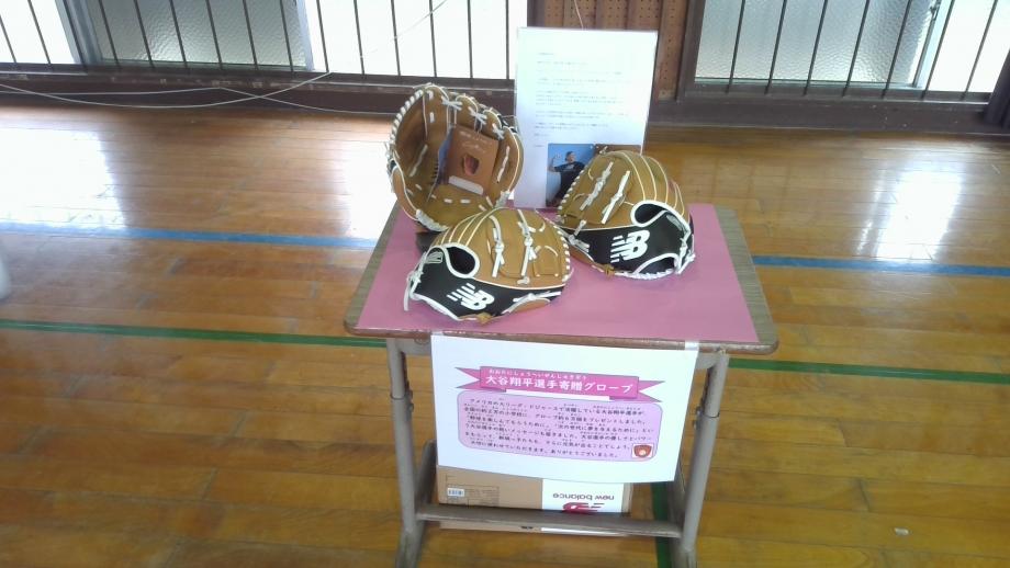 また、1月18日に、メジャーリーグのロサンゼルス・ドジャースの大谷選手が全国約2万の小学校に贈っているグローブが本校に届きました。本日、子供たちにも大谷選手から届いたグローブを披露しました。なわとび集会に来られていた保護者、地域の方々も大谷選手のグローブに興味津々でした。
