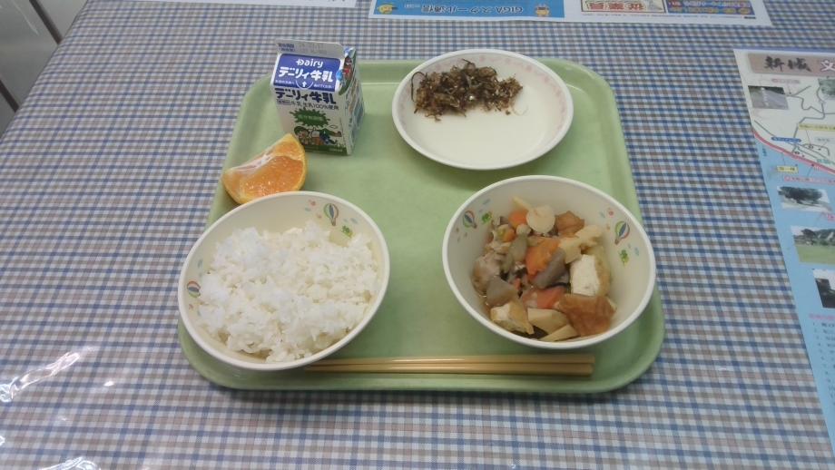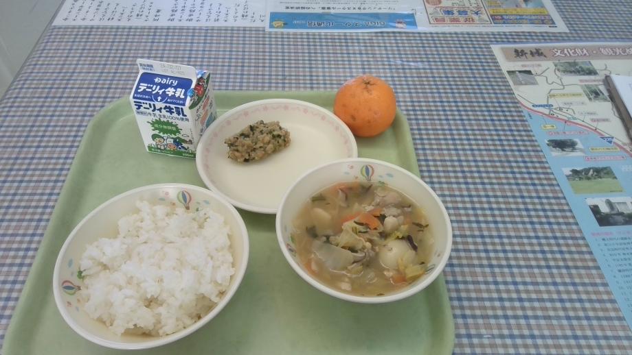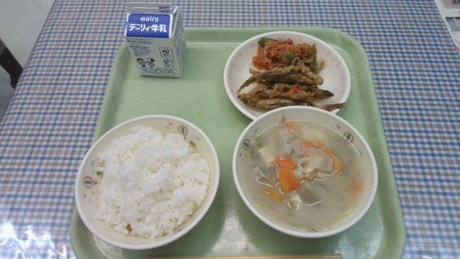 1月19日の給食は、本校の子供が、2学期の家庭科の授業で、垂水学校給食センターの栄養教諭の先生が来校されたときに考えたメニューでした。メニューは、ごはん、きびなごの天ぷら、にんじんのごまおかかいため、ぶたじるでした。和風給食をイメージして、鹿児島県の郷土料理ぶた、、地場産物のきびなごやにんじんを使った献立を考えました。
