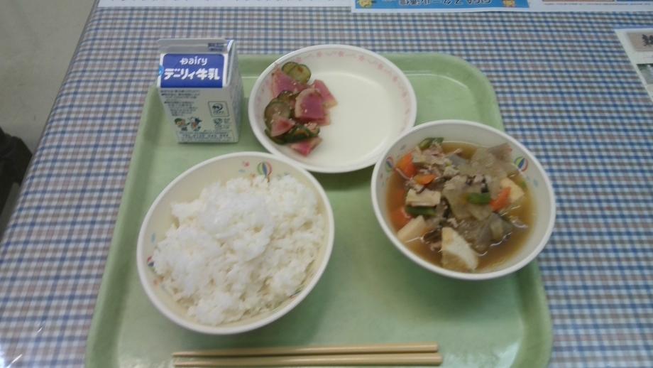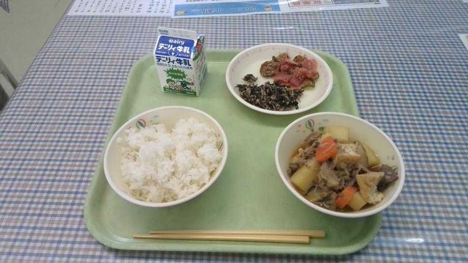 2月27日の給食のメニューは、むぎごはん、にくじゃが、手づくりふりかけ、こうしんだいこんのこうみあえ、牛乳でした。