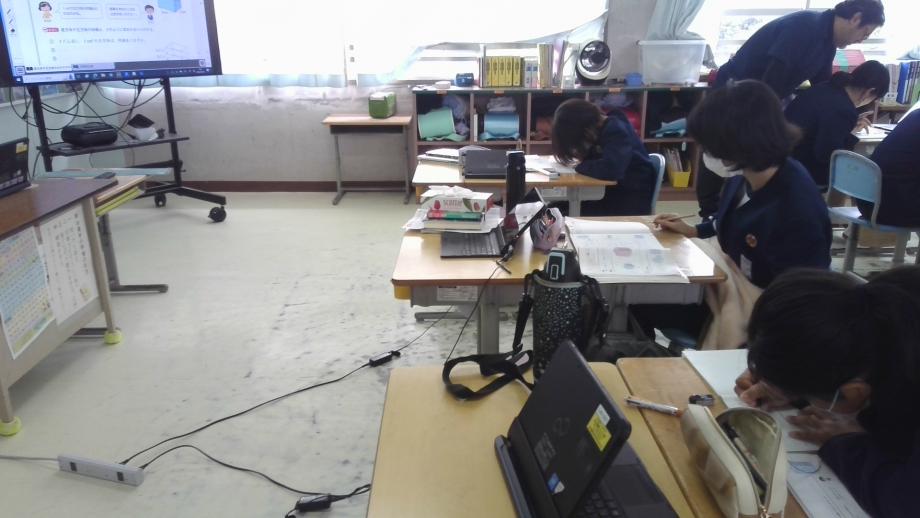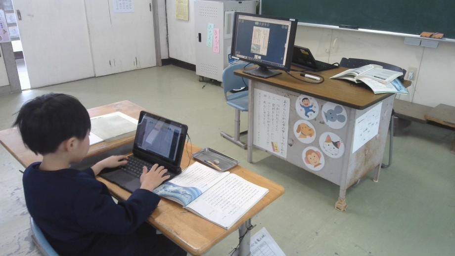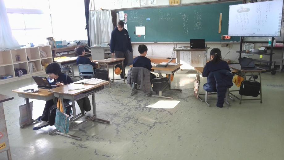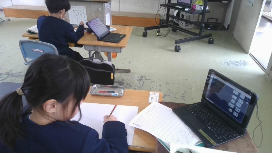 2月16日の1・2年生の国語の授業の様子です。1・2年生ともタブレット、紙媒体をミックスして、自分から進んで学習に取り組んでいました。
