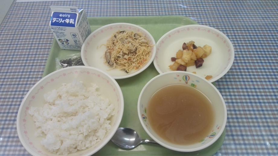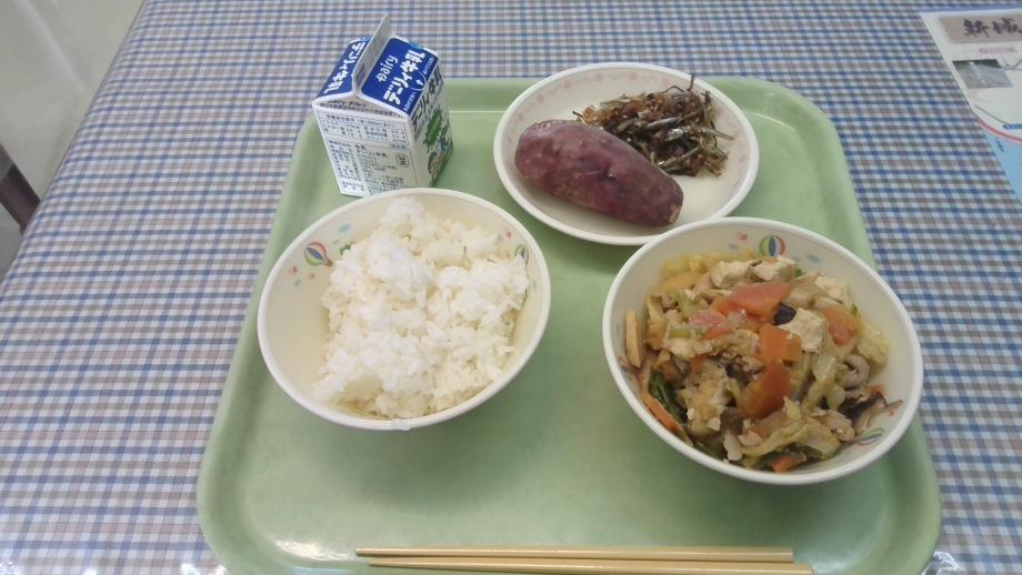 給食のメニューは、すくなめごはん、牛乳、ぶたにくとあつあげのみそいため、いそミックス、つらさげいもでした。1月の垂水学校給食センターの献立予定表によると、大野原(うのばい)のつらさげ芋は、ブランド芋です。収穫後軒先につるして1~2ヶ月冷たい風にさらして熟成させることで、糖度が増し濃厚な甘さになるとのことです。