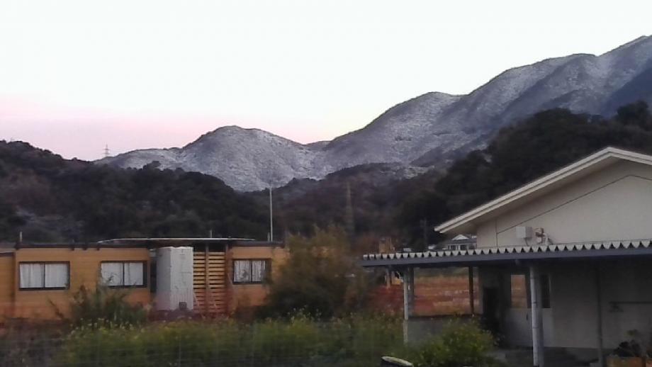 1月24日の朝は、雪がちらつく寒い朝でした。学校から見える山々もうっすらと雪が積もっていました。