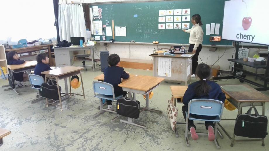 1月25日に、1・2年生は、ALTの先生との外国語活動がありました。子供たちは、英語の絵カードや大型テレビを見ながら、好きな果物を英語で元気よく答えていました。