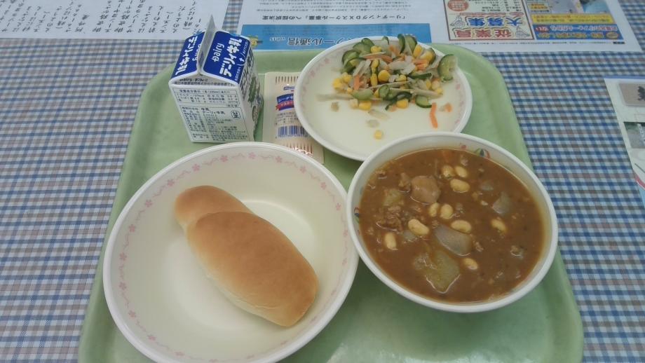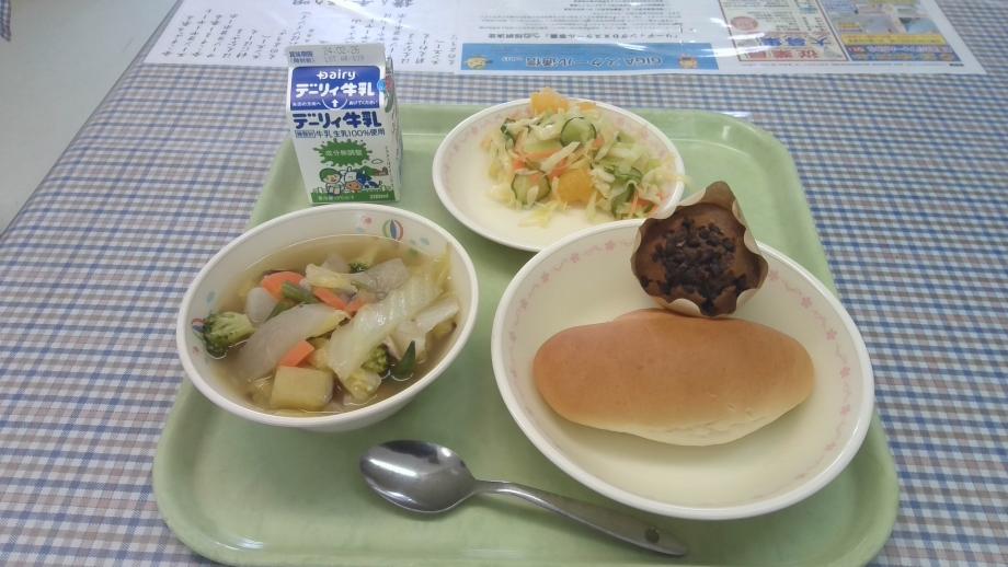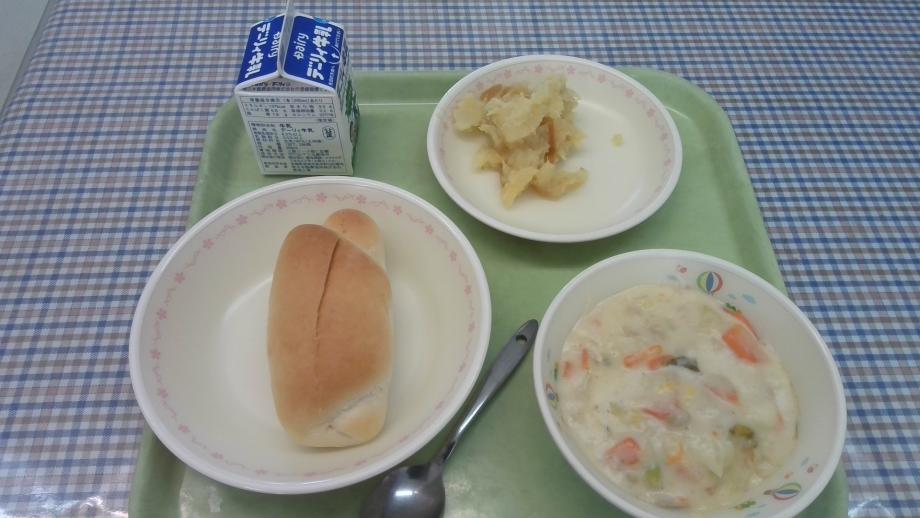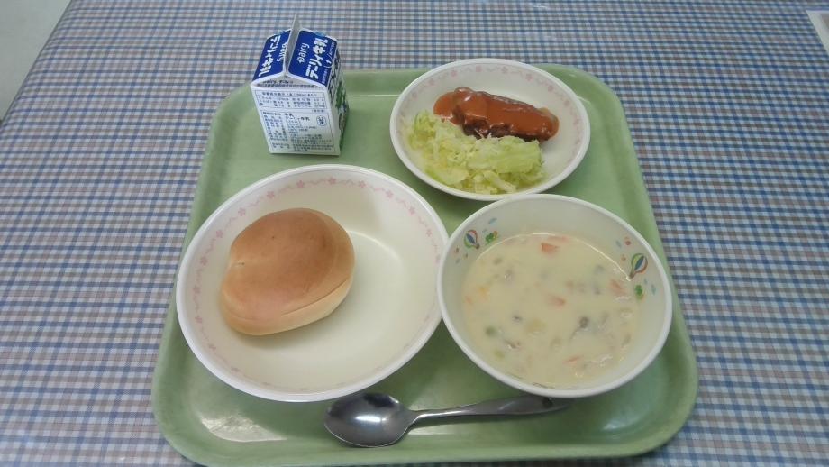 21日の給食のメニューは、バーガーパン、クラムチャウダー、かんぱちのオーロラソース、ボイルキャベツ、牛乳でした。