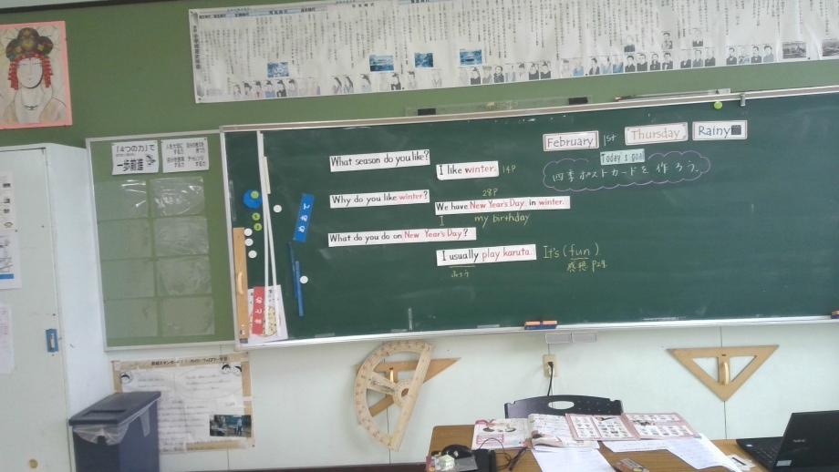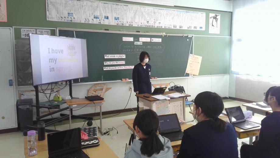 2月8日は、5・6年の外国語科の授業は、パフォーマンステストがありました。6年生は、自分の一番の思い出をこれまで学習した英語の簡単な表現を使って、5年生に伝えることができました。写真を組み込んだスライドを作成するとともに、ジェスチャーを使って、分かりやすく伝えようという姿が見られました。5年生は自分の好きな季節、その季節が好きな理由、その季節でどんなことをして、どんな気持ちになるか、タブレット端末でスライドを作成し、イラストを効果的に使いながら、声の大きさ、速さに注意して、6年生にわかりやすく伝えることができました。