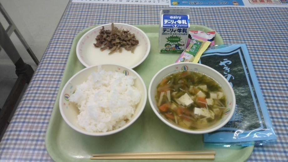 2月1日の給食のメニューは、たるみずのごはん、たまねぎのみそ汁、いわしのかばやき、ゆかりあえ、牛乳でした。