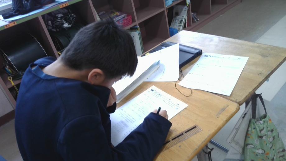 4年生は、学年末に入り、1年間の学習の復習に取りかかっています。問題を解きながら、分からないところは先生と確認しながら取り組んでいます。