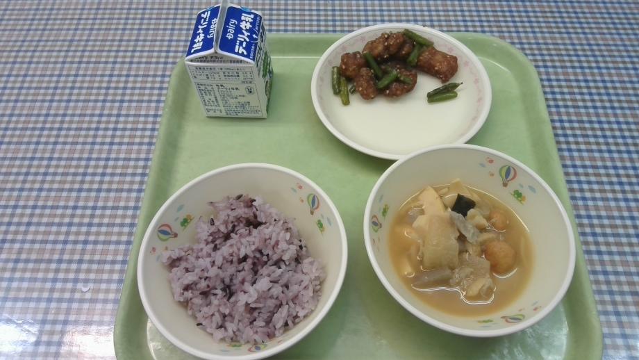 2月5日の給食のメニューは、くろごめごはん、スタミナいんげん、にしめ、牛乳です。黒米は、垂水市の方が生産されたものです。