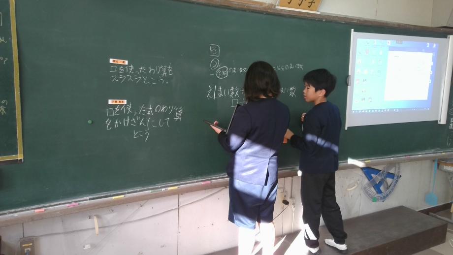 3年生は、算数科で単元内自由進度学習に取り組んでいました。タブレットで問題を確認した後、黒板に解き方を書いたり、プリントで適用問題を解いたりしていました。自分たちで、学習計画にそって、学習に取り組む姿勢がすばらしいです。