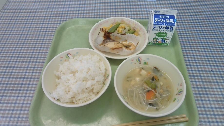 2月6日の給食のメニューは、むぎごはん、かぼちゃのみそしる、かんぱちのおうごんやき、スナップえんどうソテー、牛乳でした。