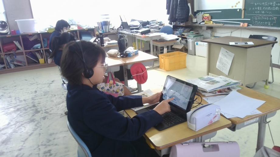 4年生は、国語で意見文を書いていました。教科書の文章を参考に、タブレット端末で、はじめ、なか、終わりにわけて、災害への備えの意見文がくわしく書けています。