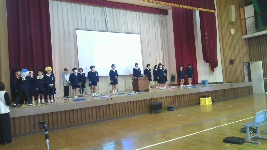 風が強かったので、学校に帰ってきて、体育館で昼食・自由遊びをした後、お別れ集会をしました。5年生がお別れ集会の進行をがんばりました。全員でレクリェーションを楽しんだ後、各学年から6年生に向けての出し物やクイズ等がありました。