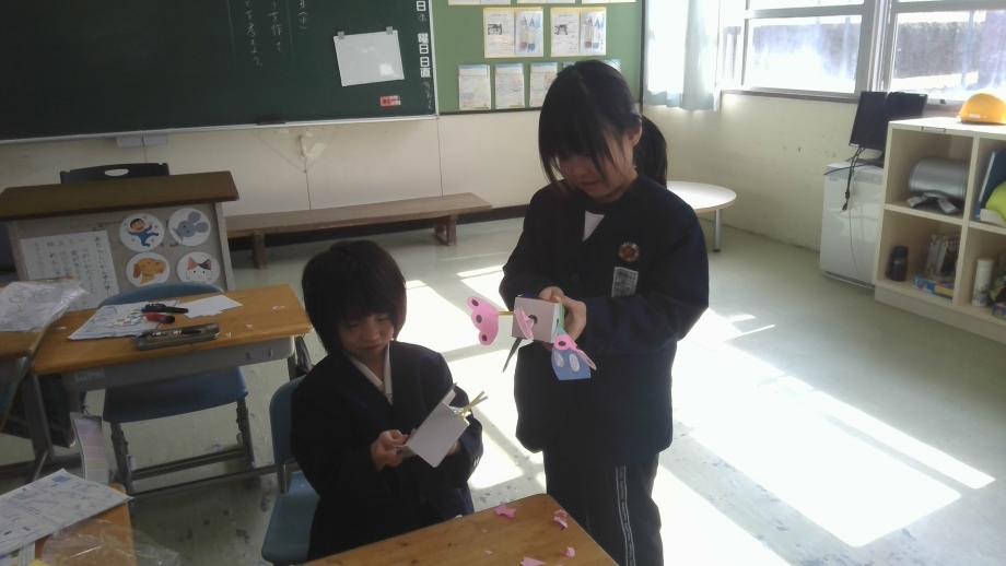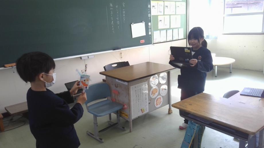 2月14日の1・2年生の図工です。パタパタストローという題材で、ストローや折り紙、型紙等を活用して動くおもちゃを作成していました。作成したおもちゃの前後の写真やおもちゃを動かす動画をタブレットで撮影していました。