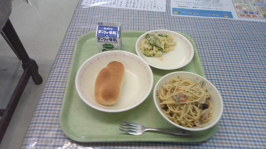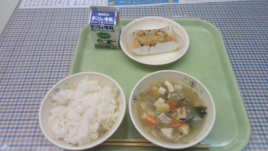 3月6日の給食のメニューは、ミルクパン、タコとごぼうのペペロンチーノ、ごまドレッシングサラダ、牛乳でした。
