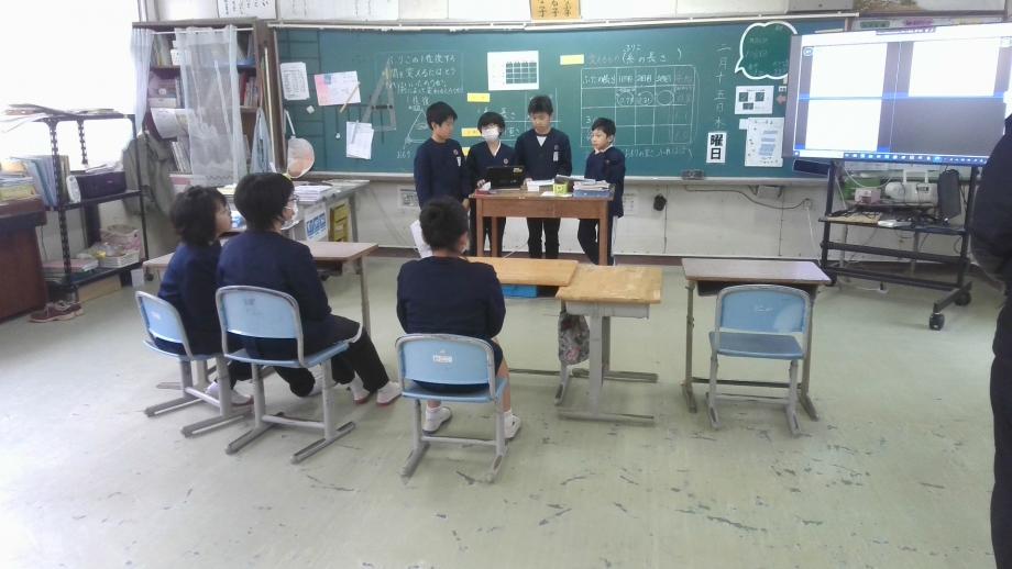 3・4年生は、ふるさと垂水のよさとかかえる課題~30年後の新城のまち~というテーマで、垂水市の面積、人口、特産物等について調べたことをプレゼンテーションソフトを活用して、堂々と発表することができました。クイズ等を取り入れ、発表を聞く人が興味をもてるよう工夫していました。また、30年後の新城の町を教育版マインクラフトを活用し、高齢者施設、公園の遊具をうまく表現していました。
