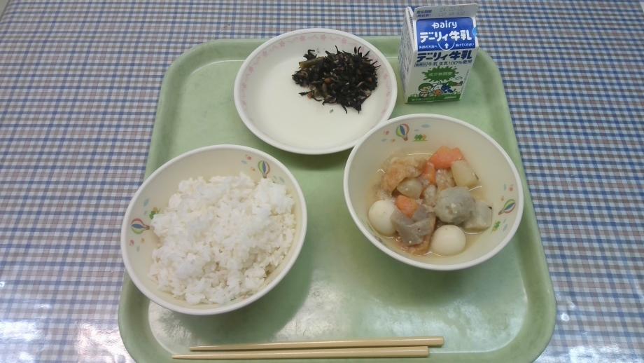 2月19日の給食のメニューは、むぎごはん、みそおでん、ひじきのつくだに、牛乳でした。