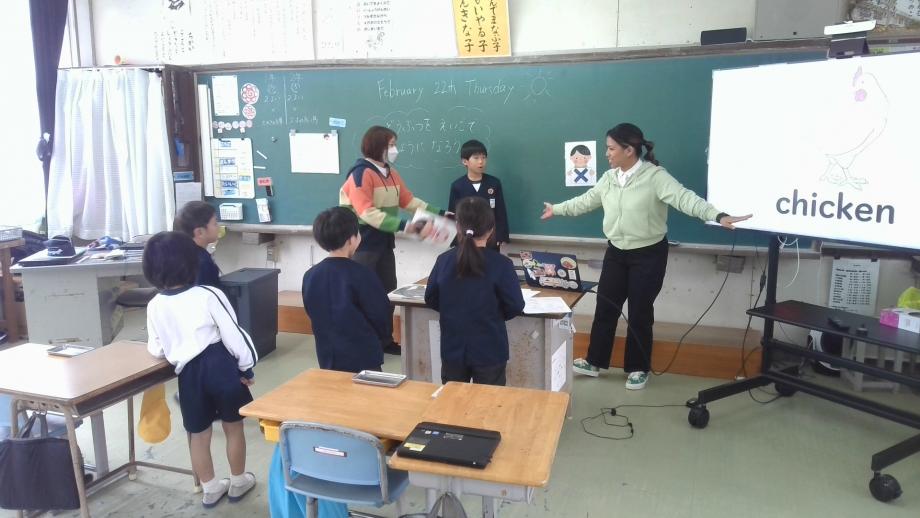 1・2年生は、ALTの先生と英語学習に取り組んでいました。好きな動物を予想して、英語で答えるゲームに楽しそうに取り組んでいました。