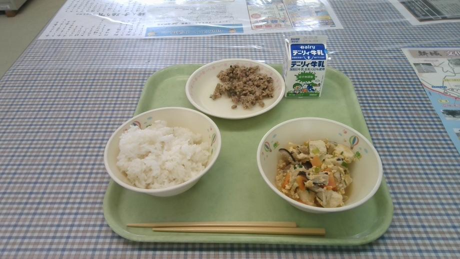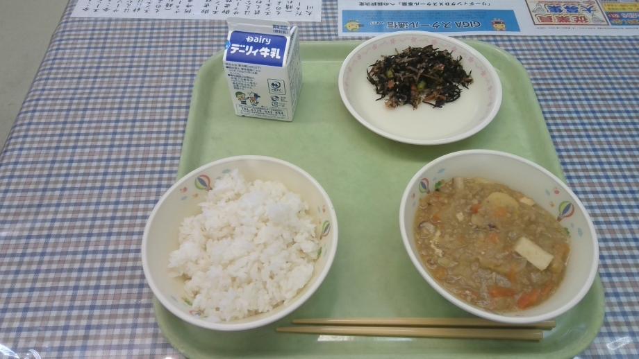 3月18日の給食は、むぎごはん、じゃがいものそぼろに、ひじきときくらげのいために、牛乳でした。本年度の給食も後2日となりました。