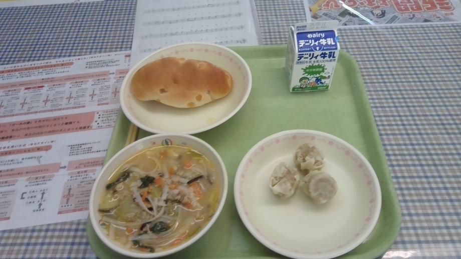 2月28日の給食のメニューは、アップルパン、ぴりからフォー、しゅうまい、牛乳でした。